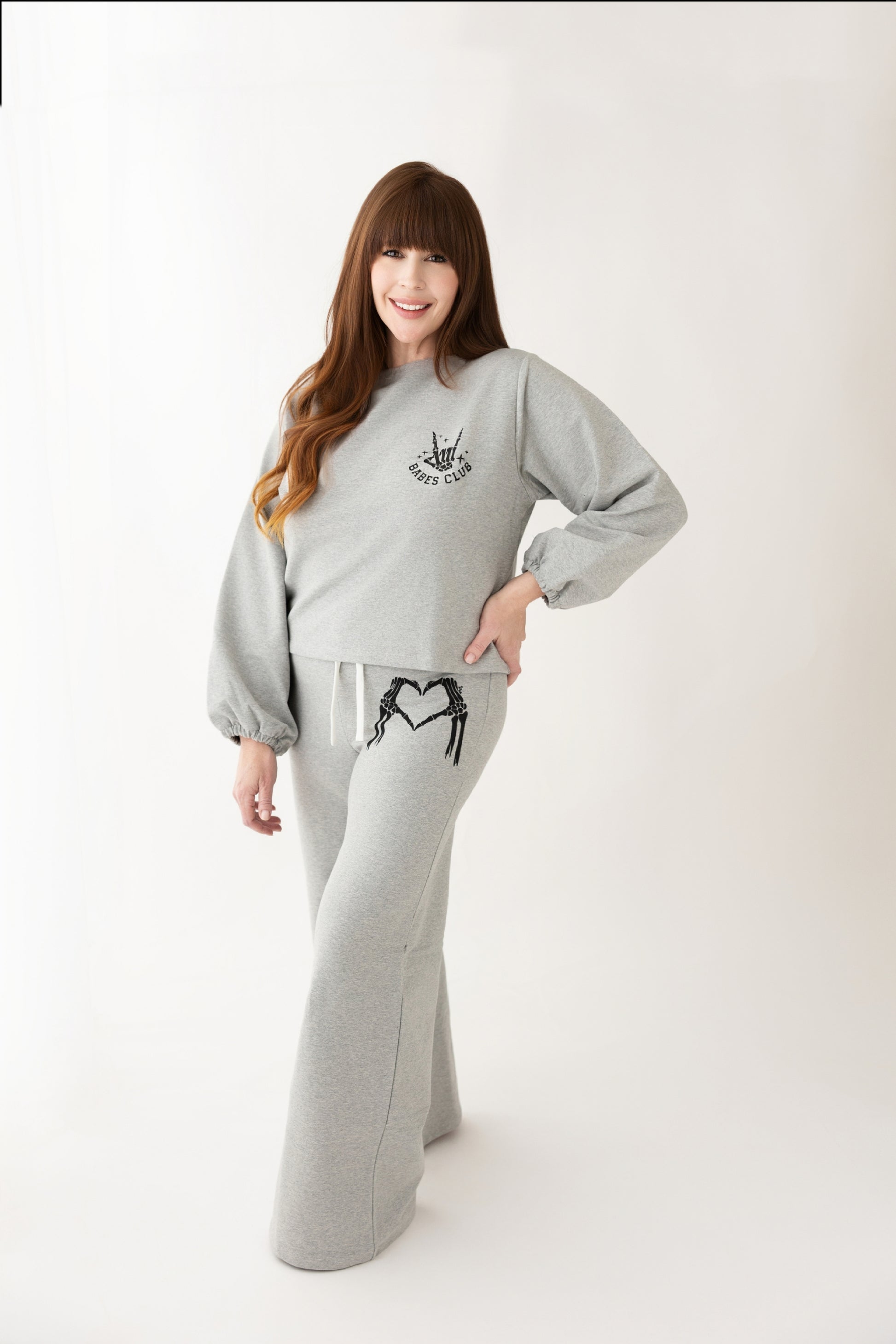 The top features a wide neck crewneck fit with bubble sleeves and soft elastic cuffs, hitting just below the waist for that laid-back, flattering silhouette. The matching flared pants bring the drama with a wide-leg cut, comfy elastic waistband, and a functional ribbon-tie drawstring for that extra sweet detail.